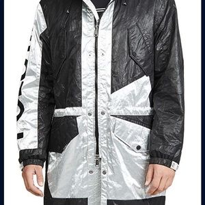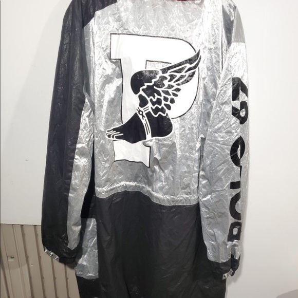 Polo Ralph Lauren's limited edition reissued 1992 Stadium Collection. Nylon constructed jacket offers full-length zip front closure with buttoned overlay, long sleeves with adjustable button cuffs and adjustable drawstrings at hood, waist + hem for a completely customizable fit. Branding and graphic details emblazon the front + back while shoulders offer colorblock styling. Finished with front slip pockets and a fishtail hem.