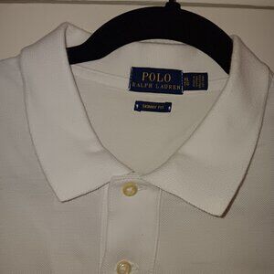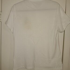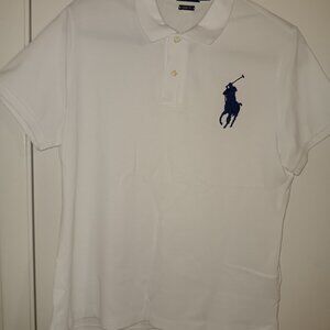 Polo Style Ladies Shirt. Large Navy Blue Pony. 2 Button. Has slight discoloration on back left of shirt from the dry cleaners master presser. Please see phros.