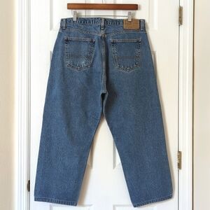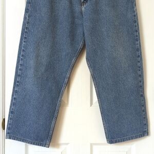 VTG and straight out of the 90s - These amazing jeans feature a medium indigo wash, straight leg, cropped length, and a relaxed fit. They have a zipper and button closure, belt loops, and open pockets on the front and back. They have a brand patch on the back right hip and a brand flag on the front right pocket. Extremely nostalgic look with a classic Y2K vibe! Easy to style and wear year round! Pair with graphic tees and sneakers for a complete retro look! High quality, made to last!