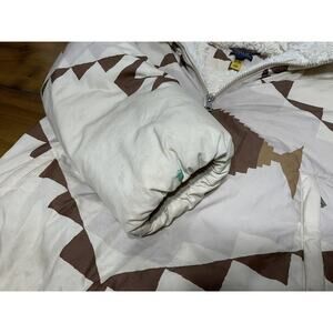 This Polo Ralph Lauren Aztec Print Cream Down Puffer Jacket is a must-have for any stylish and comfortable outfit. It features a hooded design, pullover closure, and is made with high-quality down insulation material to keep you warm in any occasion. The ivory color and Aztec theme add a touch of elegance to the jacket, making it perfect for travel, activewear, party, or casual wear. The jacket is available in size M (8-10) for unisex kids and is suitable for any season. Get your hands on this amazing Polo Ralph Lauren Aztec Print Cream Down Puffer Jacket now!pre owned is missing the hood has a few stains shown in pictures we ship fast measurements are in the pictures