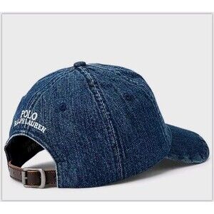 Polo Ralph Lauren BEAR Dark Wash Denim Blue Leather Strapback Baseball H…