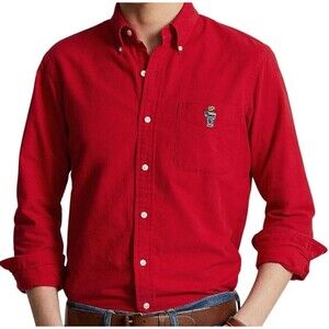 The Polo Ralph Lauren Bear Logo Oxford Shirt is a classic and preppy button-down shirt featuring a solid red color with an embroidered bear logo. Made from cotton with a woven fabric, this shirt has a collared neckline, long sleeves, and a button-down closure. Suitable for various occasions including casual, formal, and business, this shirt is machine washable for easy care. It is part of the Polo Ralph Lauren Polo Bear product line and offers a classic fit for men in size XL. This shirt is perfect for all seasons and embodies a timeless and stylish look.