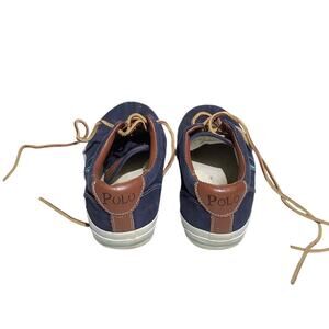 Step out in timeless Polo Ralph Lauren style with these blue canvas sneakers accented by brown leather details. Designed for everyday comfort with a versatile look, these sneakers pair perfectly with casual, preppy, and lifestyle outfits. The canvas and leather combination makes them durable yet stylish for a variety of occasions.