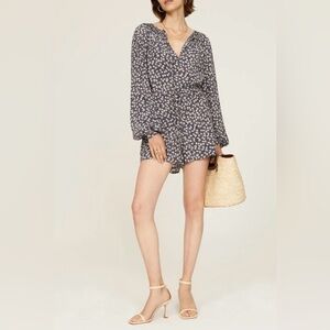 Blue floral viscose (100% Viscose) Romper. V-neck. Long sleeves. Pull-on. Imported.