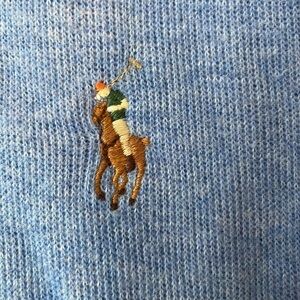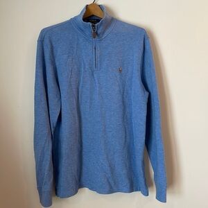 *Pullover long sleeve shirt that is light blue in color, 3/4 zip front, polo logo on front, Soft/Stretchy, Estate Rib
