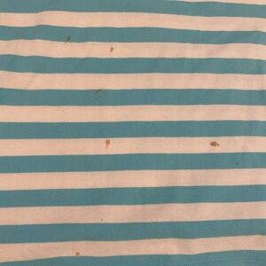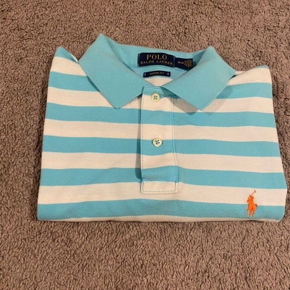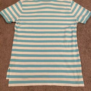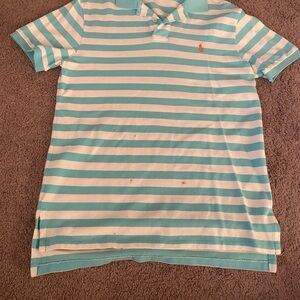 Chic Ralph Lauren polo with aqua and white stripes. Features a classic collar and button-up style. Some marks on the front, please see pics.