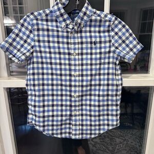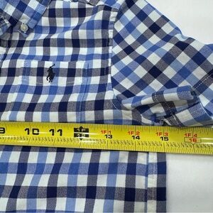 Excellent like new boys Polo Ralph Lauren button down check shirt. Short sleeves, pony logo, blue, black & white size 7. See photos for measurements