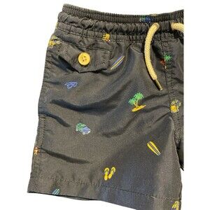 Adorable Polo Ralph Lauren swim trunks for boys, size 3T. These navy blue swim shorts feature colorful beach-themed prints (flip flops, surfboards, palm trees, sunglasses) and a comfortable mesh lining. Elastic waistband with drawstring and a buttoned back pocket. Made of durable 100% polyester perfect for summer fun.