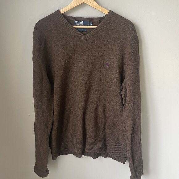 This is a Polo Ralph Lauren men's sweater in size XL. It is a brown wool knit pullover with a V-neck and long sleeves. The design is minimalist with embroidered logo accents. The sweater is suitable for travel and casual wear, featuring a tight-knit construction and collarless style. Ideal for all seasons, it offers a classic and preppy look for various occasions.
