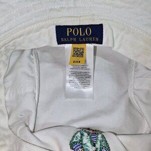 Authentic PRL Polo Ralph Lauren bucket hat with the Polo Bear - in white. Note this has some stains as shown and inside the hat. I have not washed it because of the fear of it fading.... but the stains are not that visible. But please note that there are some stains. Priced accordingly. Hat is still in very good condition and the bear is flawless. I will double wrap in poly bag and gently roll it in the bag for shipping to you.