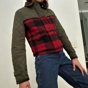 Wool Buffalo plaid jacket with green quilted upper and sleeves, corduroy collar; zipper and button front closure; six snap button pockets, four in front and two in back; back design mimics hunting jacket bird bag; adjustable tabs at cuffs; leather straps at zipper; upper shell 100% polyester; plaid fabric 85% wool, 15% nylon;