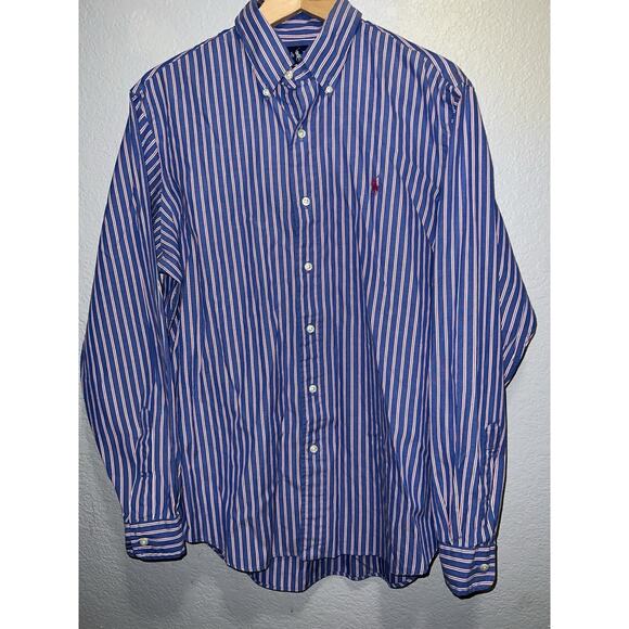 Pink Pony This Polo Ralph Lauren Button Down L shirt in a classic fit is perfect for men who appreciate a timeless and versatile style. The shirt features a beautiful purple and blue striped pattern, a collared neckline, and long sleeves ideal for all seasons. Made from woven cotton fabric with a chest size of 44 inches, this button-up shirt is machine washable for easy care. The Polo Ralph Lauren brand is known for its classic theme and quality craftsmanship, making this shirt a staple addition to any man's wardrobe.