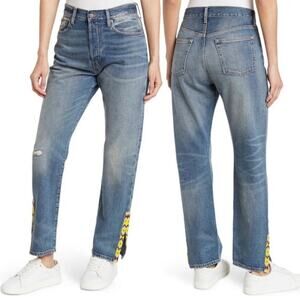 Southwestern inspired yellow beading, slit at ankle, medium wash