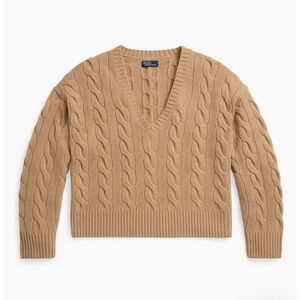 NWT POLO RALPH LAUREN sold out 20% cashmere and wool blend v neck sweater. XS. Elegant cable knit V-neck sweater. Soft camel color. Perfect for layering. this is a classic that will never go out of style. current and retail almost $300 grab her and save some $. FIRM. no further discounts for her. still a bargain. brand tag semi-detached easy fix. ptp 22 length 21 apprx measurements