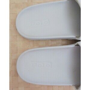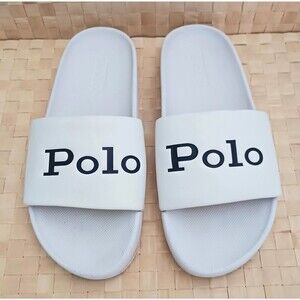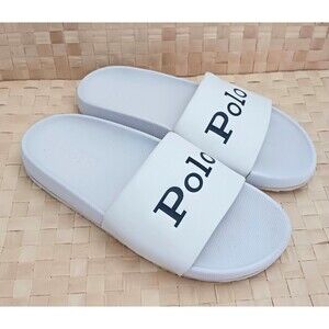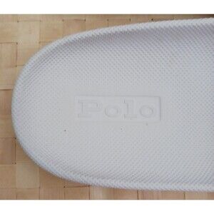 The Polo Ralph Lauren Cayson White Slide Sandals for ladies in size 7 feature a classic solid white color with the iconic Polo logo accents. These slip-on sandals have a low heel height for ultimate comfort and a flat heel style for added versatility. Made with synthetic materials, the top strap is lined and padded for comfort, perfect for everyday wear. The sleek slide style and signature spellout POLO detail make these sandals a stylish accessory for any woman's wardrobe. Pre owned, clean.