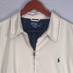 Classic Polo Ralph Lauren Lined Bi-Swing Jacket in Creamy Light Khaki. Peached microfiber shell is super soft, cotton plaid lining, full zip, pockets, elastic waist, button cuffs, blue embroidered pony on chest.