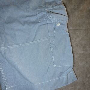 The Polo Ralph Lauren Classic Fit Chino Cargo Shorts in Blue striped are a stylish and versatile option for men. These shorts feature a classic chino style with a flat front and belt loops, perfect for a casual or workwear occasion. Made of cotton twill fabric, these shorts are easy to care for and machine washable. The added cargo pockets and solid gray color make them a practical and timeless addition to your wardrobe. Upgrade your summer, fall, or spring look with these preppy and classic shorts from Polo Ralph Lauren. 46B size. as is.