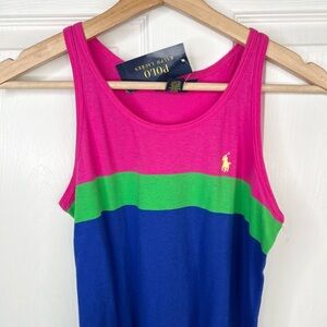 This Polo Ralph Lauren girls tank is a size XL in a regular fit. It features a multicolor colorblock pattern and is made from soft, breathable fabric. The sleeveless design and basic style make it suitable for casual occasions. The iconic Polo Ralph Lauren logo adds a distinctive touch. The tank is new with tags.