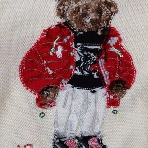 Stylish cream sweater featuring a bear in a red jacket. Adds a playful touch to any outfit.