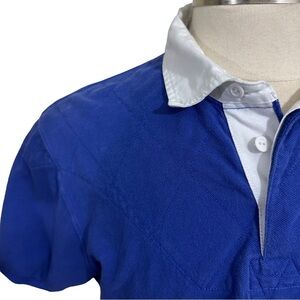 Polo by Ralph Lauren Custom Fit Men’s Royal Blue with White Contrast Collar and Yellow Big Pony Padded Shoulders Vents for Armpits Short Sleeve 2 Button Rugby Polo Shirt Sz XXL 2XL. This rugby polo is preowned and in very good condition.