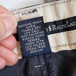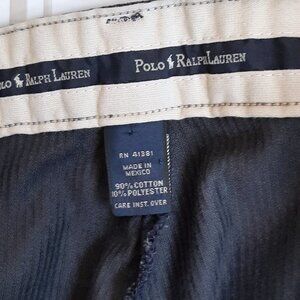 Polo Ralph Lauren Dark Navy (Almost Black) Pleated Corduroy Slacks Pants. Good preowned condition with light wear. Button closure, zipper fly. Pleated front with back slip pocket. Slight tapered leg.
