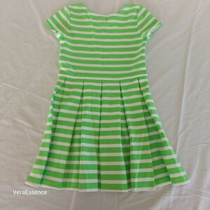 This Polo Ralph Lauren dress is a stylish option for young girls in size 6. The green and white striped pattern, along with pleated accents, gives it a preppy and classic look. The dress features short cap sleeves, a round neckline, and a pullover closure, making it easy and comfortable to wear. Made from a blend of polyester and viscose, the knee-length dress is machine washable and perfect for casual occasions during the summer, fall, and spring seasons.