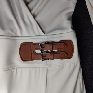 This elegant white dress features a stylish brown accent, perfect for any occasion. Its sophisticated design offers a flattering fit and timeless appeal.