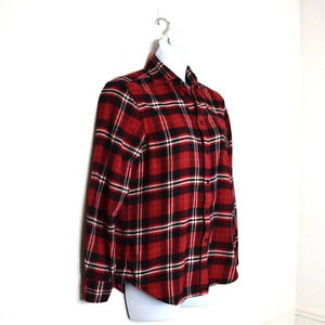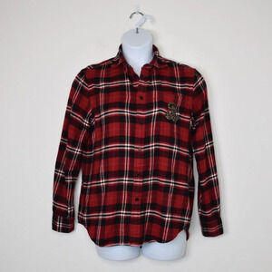 Pre-owned, good condition w/ missing rhinestone on the monogram. No visible holes or stains. Normal signs of wash and wear. Classic plaid pattern in shades of red, black and white. Button down. Collared. Long sleeves w/ button cuffs. Chest pocket with rhinestone monogram. Soft and cozy. Size per tag: L (Large). Fabric: 100% Cotton. Made in India. Size per tag does not guarantee desired fit, please see pictures for measurements.