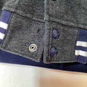 Jacket is a store reject because 2nd last snap closure at bottom inner snap is missing- see photos. The outer snap button is there so it’s not noticeable and jacket can still be fully closed. Other than that the jacket is new condition. 100% thick cotton fleece with hood. Navy blue & white striped Elasticated sleeve cuffs & hem. Dark grey body, light grey sleeves. Size men’s Medium. Length from shoulder 25.5”. Sleeve length 25”. Chest 46”.