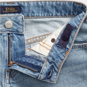 Five-pocket styling with signature metal rivets. "Polo" label at the coin pocket. Faux-suede "Polo Ralph Lauren" patch at the back right waist.