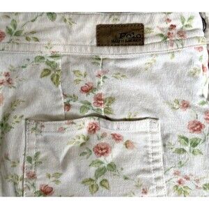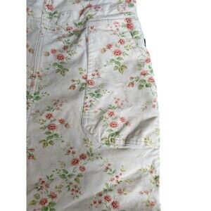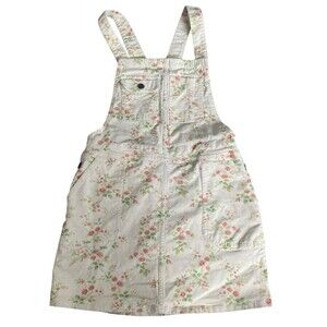 Beautiful Polo Ralph Lauren girls floral corduroy overall jumper dress, size 16. Features an ivory base with soft pink rose print, front chest pockets, and adjustable straps. Vintage-inspired cottagecore look. Great preppy or retro piece perfect for layering year-round.