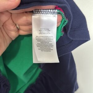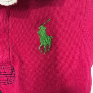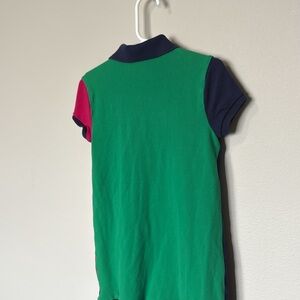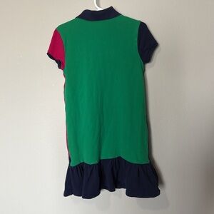 This is a rare Polo Ralph Lauren Preppy Dress with a navy blue collar and chunky color blocks of navy blue, bright pink, and green with a navy blue ruffled out bottom for the skirt at the bottom. There is a R.L monographed logo to the right chest and a large Pony logo to the left chest. A few buttons go up the middle. Size children’s 6X. Excellent condition. Very unique.