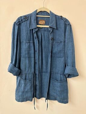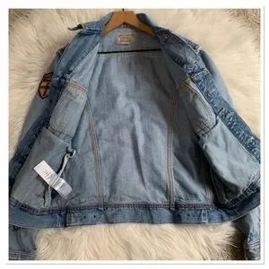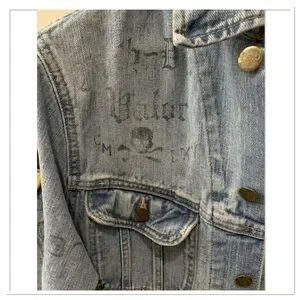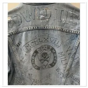 Light Blue Denim Long Sleeve Button Up Front All Over Graffiti Print Front And Back Patch Detail Distressed Jean Jacket By Polo Ralph Lauren Size Medium