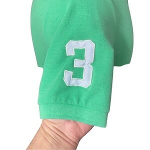 Polo Ralph Lauren Men’s Green with Embroidered Big White Pony and the Number 3 on the Sleeve 100% Cotton Short Sleeve Polo Shirt Sz Large. This pony polo is preowned and in very good condition.