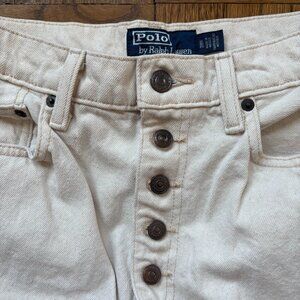 Fitted through the hip and thigh with a wide leg. Intended to hit above the ankle. Five-pocket styling with signature "P.R.L. 67"–engraved metal rivets. Belt loops. Button fly. 100% cotton.