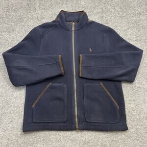 Polo Ralph Lauren Jacket Mens Large Navy Blue Fleece Full Zip Leather Trim Outdoor