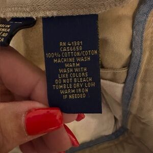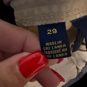 Elevate your casual wardrobe with these Polo Ralph Lauren Khaki Shorts. The relaxed fit and flat front design make them comfortable and easy to wear for any occasion, whether it's a day out in the city or a casual dinner. The shorts feature a zip closure. Made with breathable and easy-care cotton fabric, these shorts are machine washable and perfect for any season. The solid beige color and American preppy theme add a touch of sophistication to your outfit. Available in size 29, these shorts are a must-have for any fashion-conscious man.