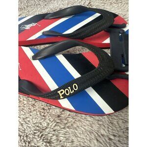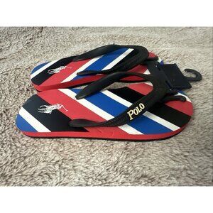 The Polo Ralph Lauren Kids Flip Flops in black, size 1, are stylish sandals perfect for boys. Featuring a slip-on closure and a blue flop design, these sandals are ideal for casual or travel occasions. With the iconic Polo Ralph Lauren logo accents, they offer both comfort and style for young boys who are active and on the go. Made for walking activities, these multicolor flip flops are a versatile addition to any boy's shoe collection.