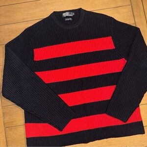 100% lambswool crewneck ribbed knit navy blue/ red striped sweater
