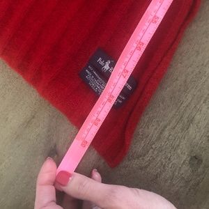 This listing is for a beautiful lambswool, red scarf. 11X60 is the approximate measurements. Gently used - see photos.