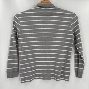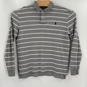 This is a pre owned Polo Ralph Lauren Large Gray White Striped Long Sleeve Cotton Polo Shirt. This item is in good condition with minimal or no signs of use.