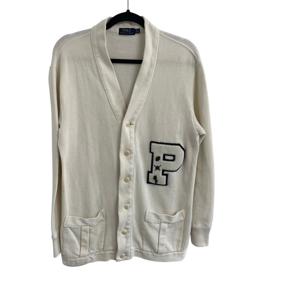 • Features: Button up front, Long sleeve, V neckline, Double front patch pockets, Varsity cardigan by Polo Ralph Lauren with P Letterman style patch on front side with baseball inspired hardware pins attached, Cream color, Cotton blend