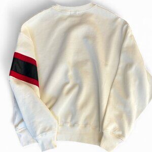 This Polo Ralph Lauren sweatshirt is brand new with tags, size Medium (M/M), in classic ivory white featuring the bold “POLO RALPH LAUREN” logo across the front and a stylish red and black stripe detail on the sleeve. Crafted from soft, premium cotton, it offers a comfortable, relaxed fit ideal for both men and women seeking a versatile, designer crewneck pullover. Perfect for layering, street style, or casual wear, this unisex sweatshirt is a must-have for fans of Ralph Lauren and those shopping for luxury athleisure or preppy, timeless essentials.