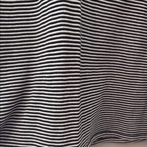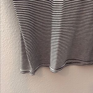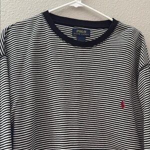 Classic black and white stripes. Red logo accent. Comfortable crewneck design.