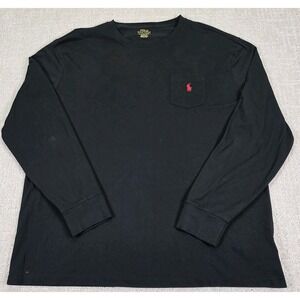 Polo Ralph Lauren Long Sleeve Classic Fit Cotton Crewneck Pocket T-Shirt in size XL is a timeless and versatile piece for any man's wardrobe. Made from lightweight cotton material, it features a solid black color with an embroidered Polo Pony logo on the pocket, adding a touch of classic style.