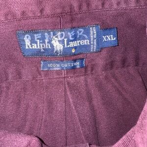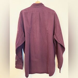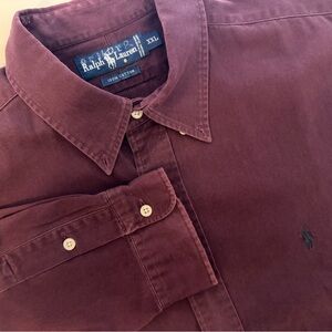 This is a classic Polo Ralph Lauren men’s button-down shirt in a deep burgundy/dark purple color. Made from 100% cotton, this shirt offers both comfort and timeless style.