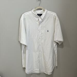 The product is a classic fit white short sleeve button-down shirt from Polo Ralph Lauren, designed for men in size XXL. Made from cotton fabric, this collared shirt features a solid pattern and button closure, perfect for casual occasions.