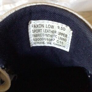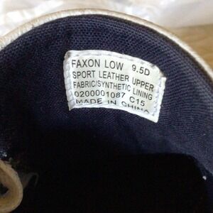 The sneaker is a size 9.5 and belongs to the men's department. It has a solid pattern with a Ralph Lauren logo accent. The outsole is made of leather, and the insole is made of fabric. It is not a vintage shoe and belongs to the Faxon Low-SK-VLC product line. It is suitable to wear in all seasons, including winter, summer, fall, and spring.