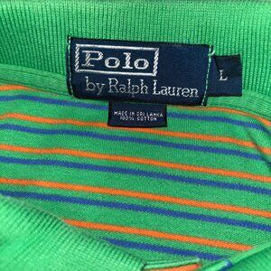 Classic Polo Ralph Lauren men’s polo shirt in a bold striped design. This short sleeve polo features bright green, orange, and blue stripes with the signature orange embroidered pony logo at chest. Made from 100% cotton, it offers breathable comfort and timeless style. Brand: Polo by Ralph Lauren Size: Men’s Large (see measurements) Color: Green with orange & blue stripes Material: 100% Cotton Style: Short sleeve polo shirt, striped pattern Logo: Orange embroidered pony logo on chest Measurements (approx., laid flat): Pit to pit: 23" Front length: 30" Back length: 32" Sleeve: 9" Condition: Pre-owned, gently used. No holes, stains, or major flaws noted. lighter at collar edge - see photos - not noticeable when worn. Ships from a smoke-free home. Ralph Lauren striped polo, vintage polo shirt, preppy Y2K style, green stripe polo, retro men’s shirt