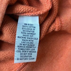 The sweater is an orange-peach color and features a multi-colored embroidered pony.
